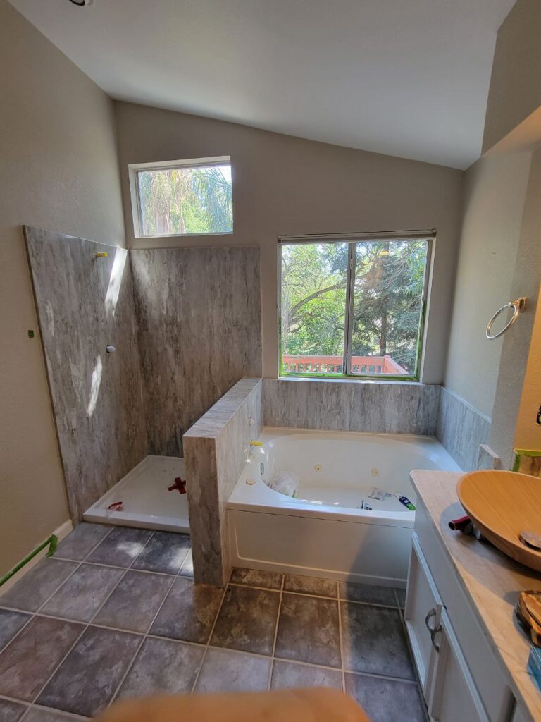 This master bathroom renovation project focused on refreshing the shower and tub surround in an upstairs suite totaling 83 square feet. The homeowner, Lisa of Folsom, was seeking a modern update that would enhance her space’s visual appeal while simplifying long-term upkeep. Having already installed a Taj Mahal quartzite countertop, she wanted a complementary material that would preserve the serene, elegant tone of the room without introducing high maintenance demands.